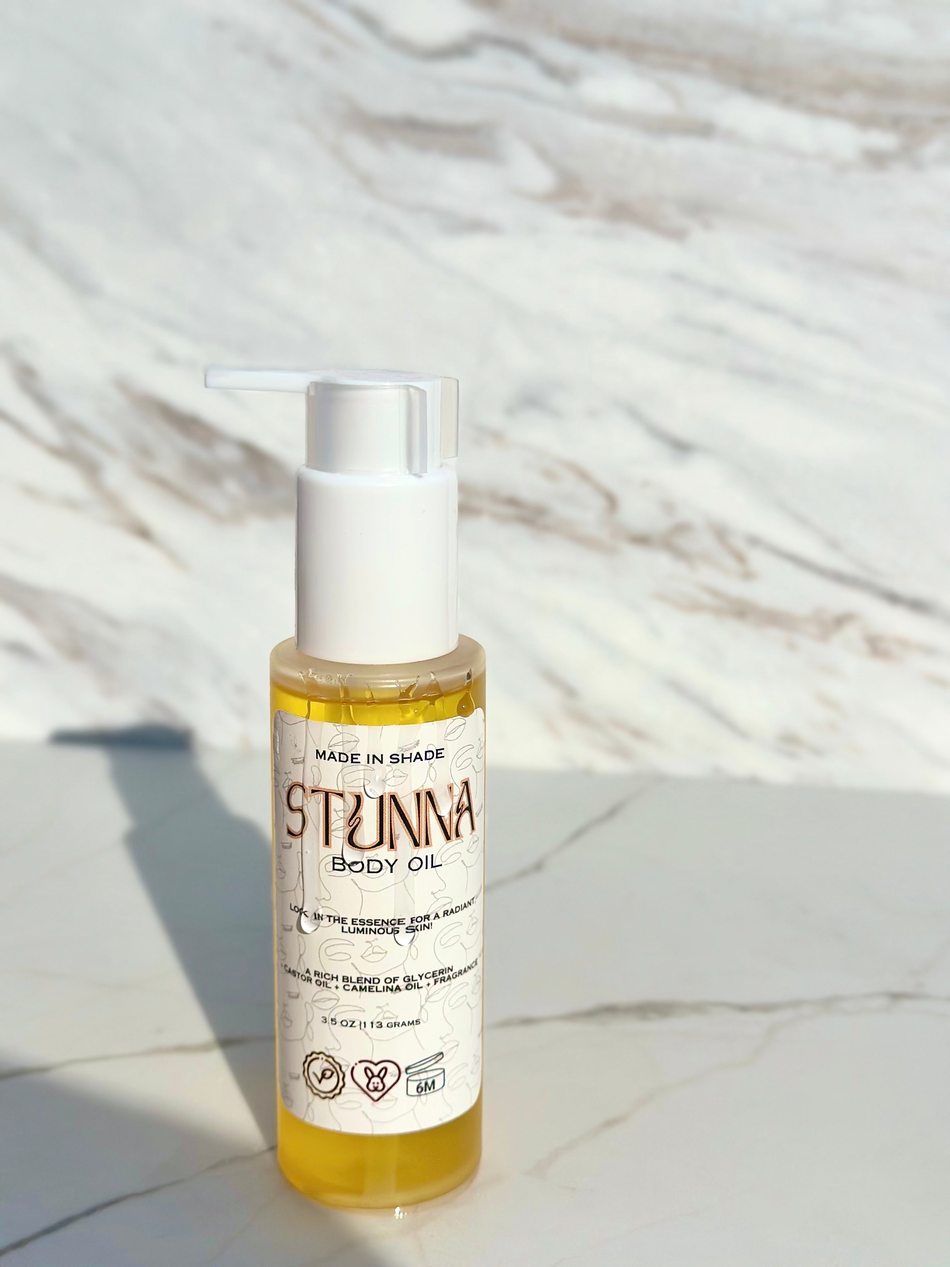 Step into a world of pure allure with Stunna Body Essence, where every drop whispers luxury and confidence. This decadent, lightweight oil glides onto your skin like liquid silk, leaving behind a mesmerizing radiance that catches the light and captivates all who pass. But it's the scent that truly enchants—an intoxicating blend infused with the deep, sensual notes of oud and musk, creating an aura of mystery and sophistication.