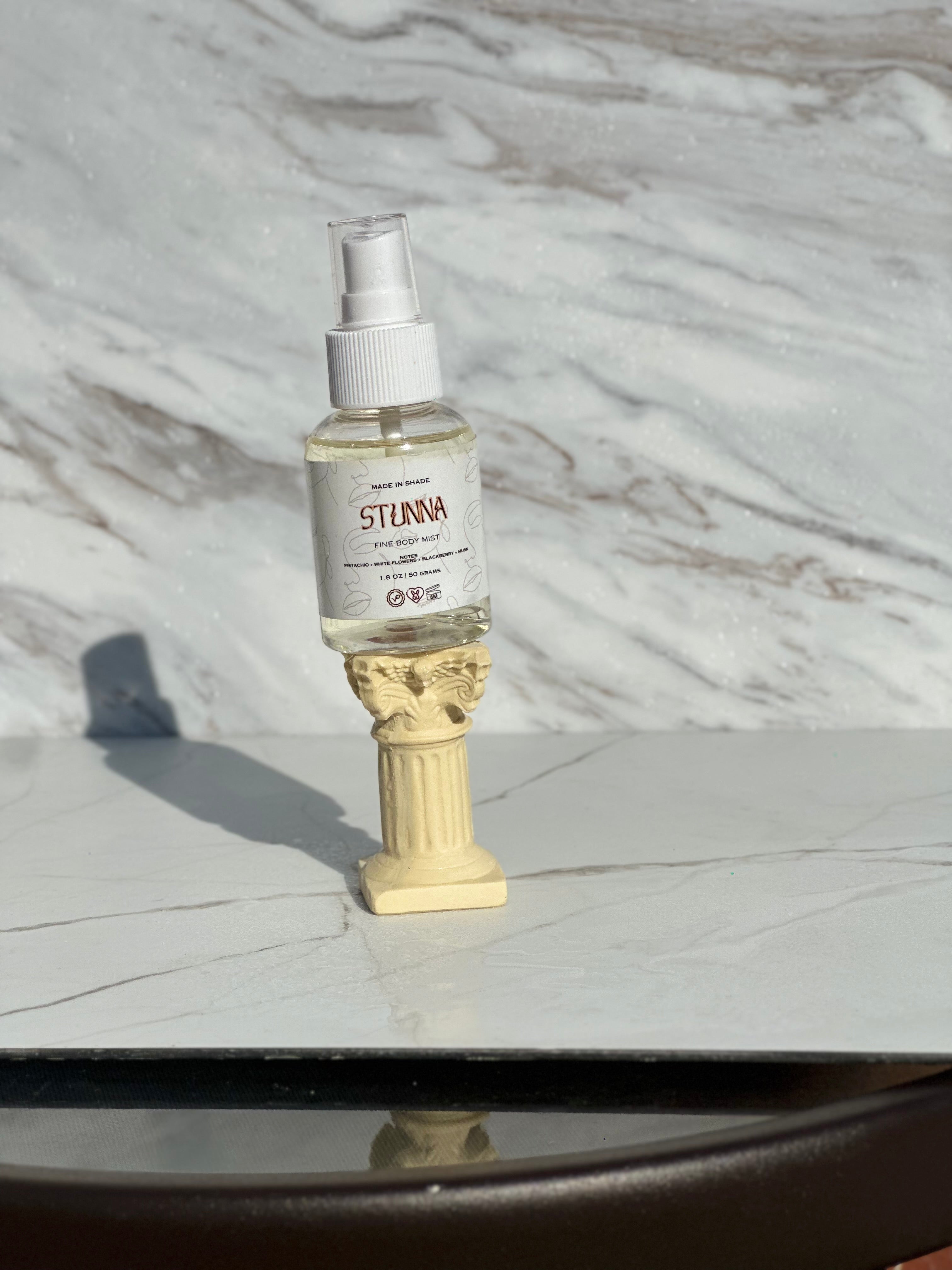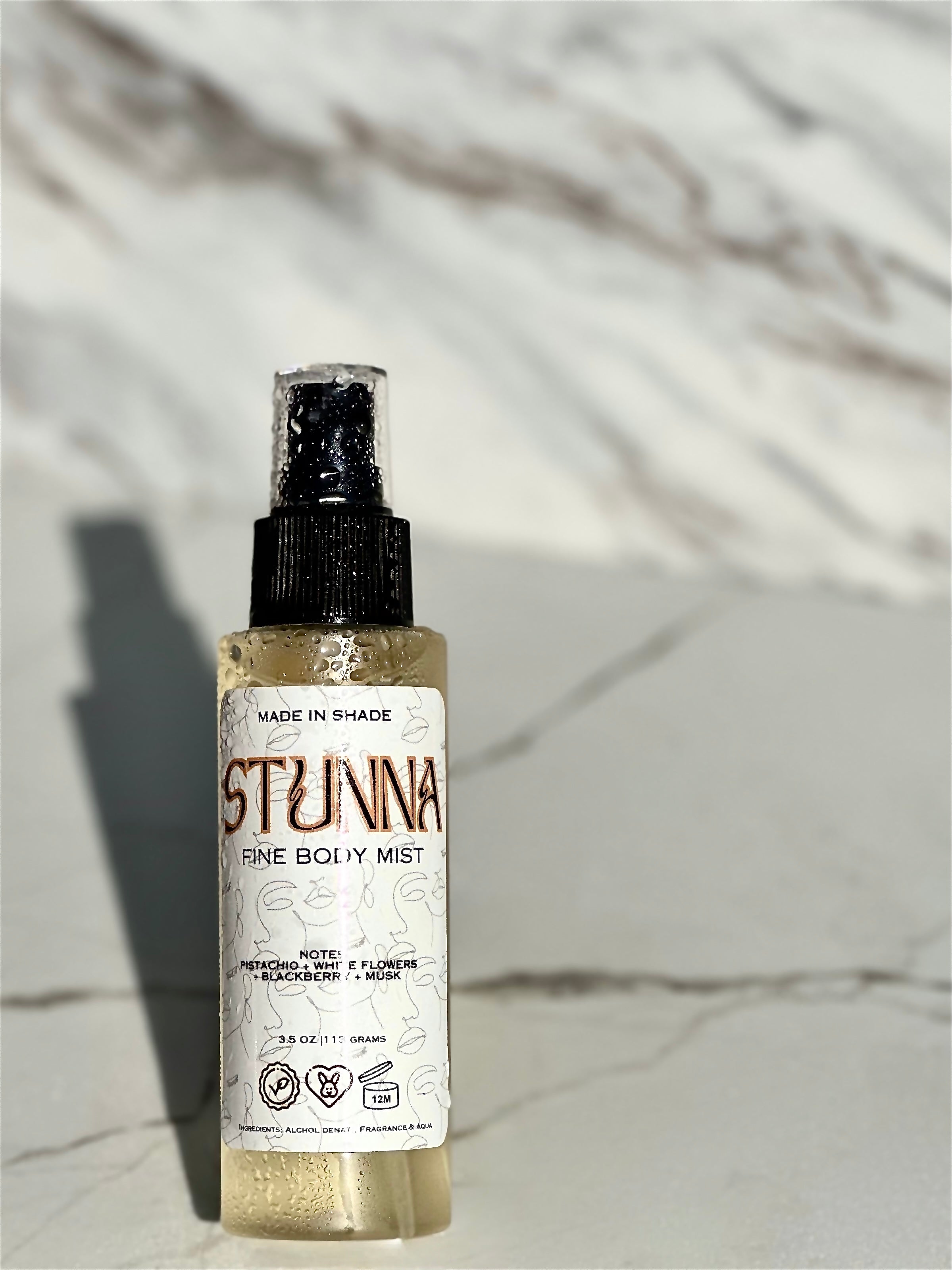 Get ready to turn heads with Stunna Body Mist—the ultimate fragrance for those who love to make a statement. This paraben-free mist is like a spray of confidence, combining the irresistible notes of creamy pistachio , vanilla and juicy blackberry, balanced with the sultry depth of musk and rich oud spritz, and you’re enveloped in a tantalizing blend that’s both sweet and bold, leaving a trail of intrigue wherever you go.
